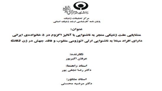 جلسه دفاع از پایان نامه اقای عرفان اکبرپور دانشجو کارشناسی ارشد مرکز تحقیقات ژنتیک دانشگاه علوم توانبخشی و سلامت اجتماعی با عنوان «منشایابی علت ژنتیکی منجر به ناشنوایی با آنالیز اگزوم در 5 خانوادهی ایرانی دارای افراد مبتال به ناشنوایی ارثی اتوزومی مغلوب و فاقد جهش در ژن 2GJB» در تاریخ یکشنبه 10 صبح 1404/06/31 در سالن آمفی تئاتر مرکز تحقیقات ژنتیک برگزار خواهد گردید.