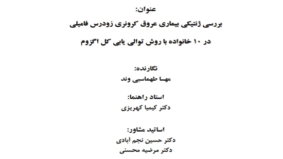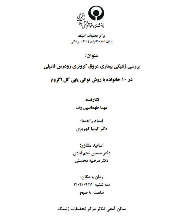 جلسه دفاع از پایان نامه خانم مهسا طهماسبی وند دانشجو دکتری ژنتیک پزشکی مرکز تحقیقات ژنتیک دانشگاه علوم توانبخشی و سلامت اجتماعی با عنوان «بررسی ژنتیکی بیماری عروق کرونری زودرس فامیلی در 10 خانواده با روش توالی یابی کل اگزوم» در تاریخ سه شنبه 8 صبح 1404/09/11 در سالن آمفی تئاتر مرکز تحقیقات ژنتیک برگزار گردید.